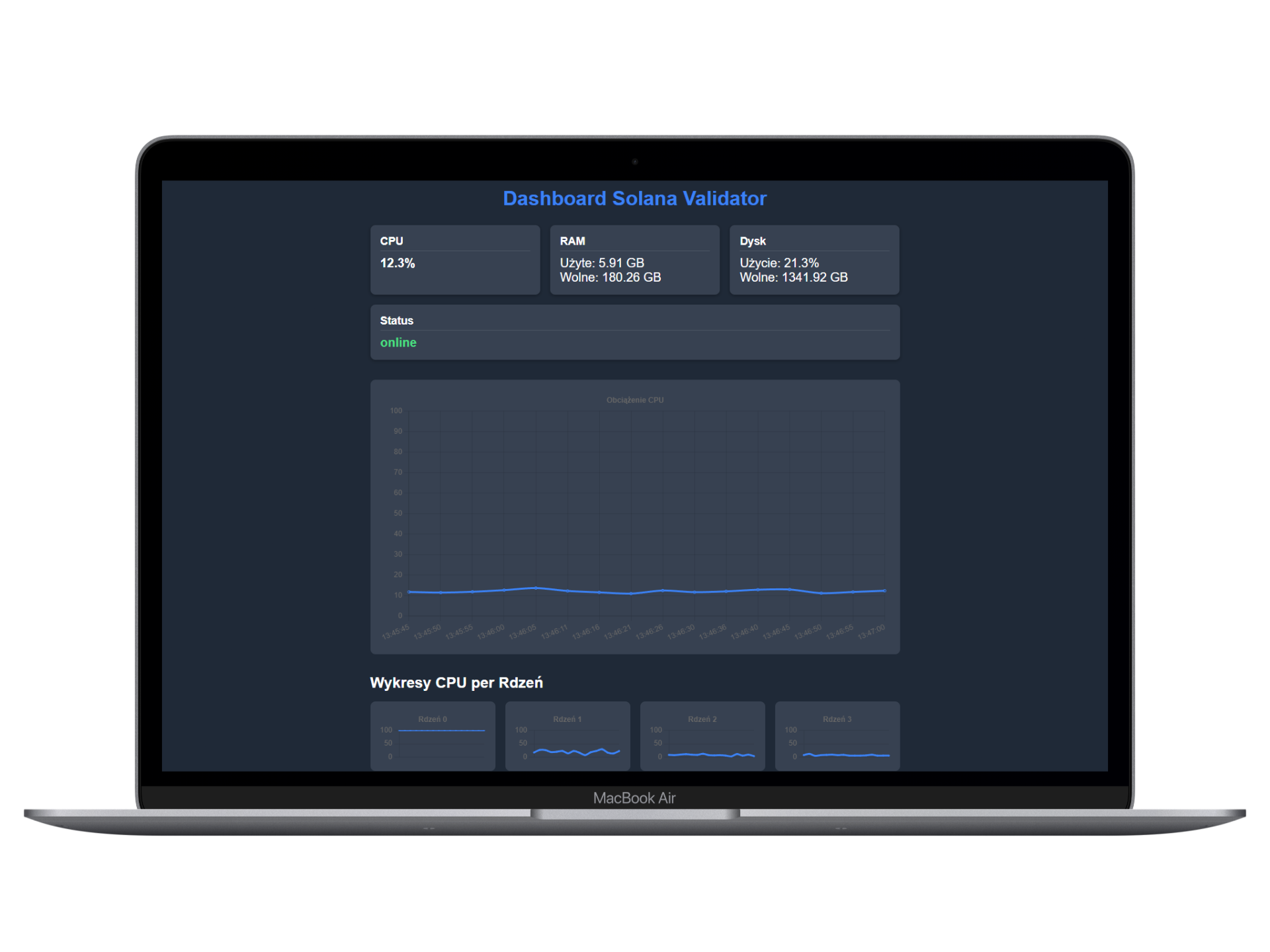 Panel diagnostyczny dla noda Solany. Wykresy użycia CPU/RAM w czasie rzeczywistym, status walidatora i integracja z CLI Solana.